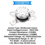 6 pièces KSD301 40°C / 104°F Thermostat interrupteur de température 250V 10A normalement fermé NC interrupteur de commande thermique pour micro-ondes avec borne à sertir 12 pièces avec fil