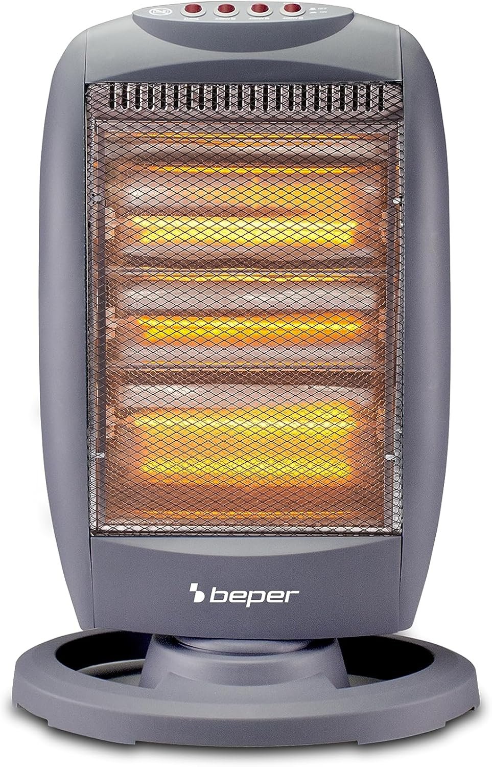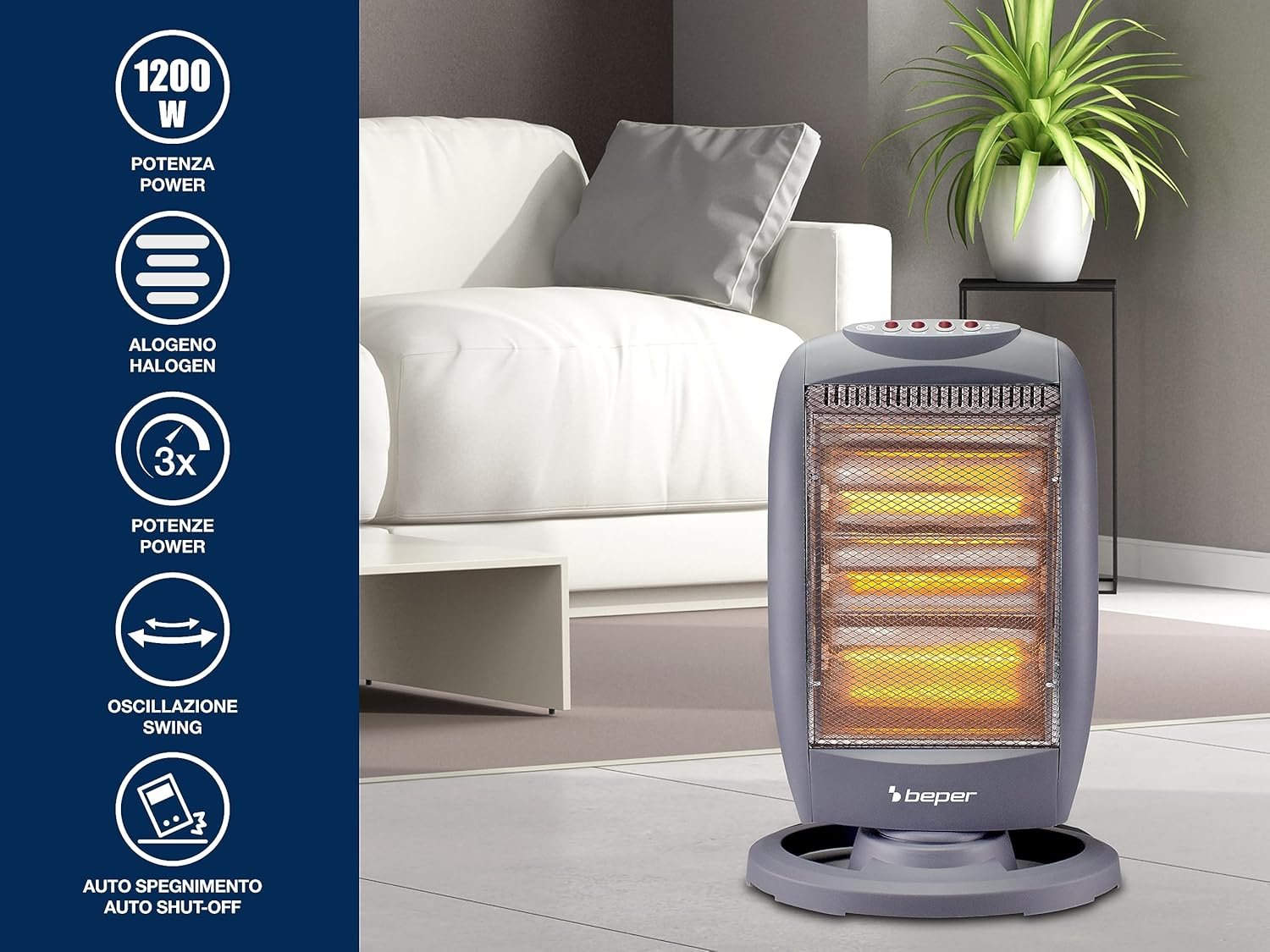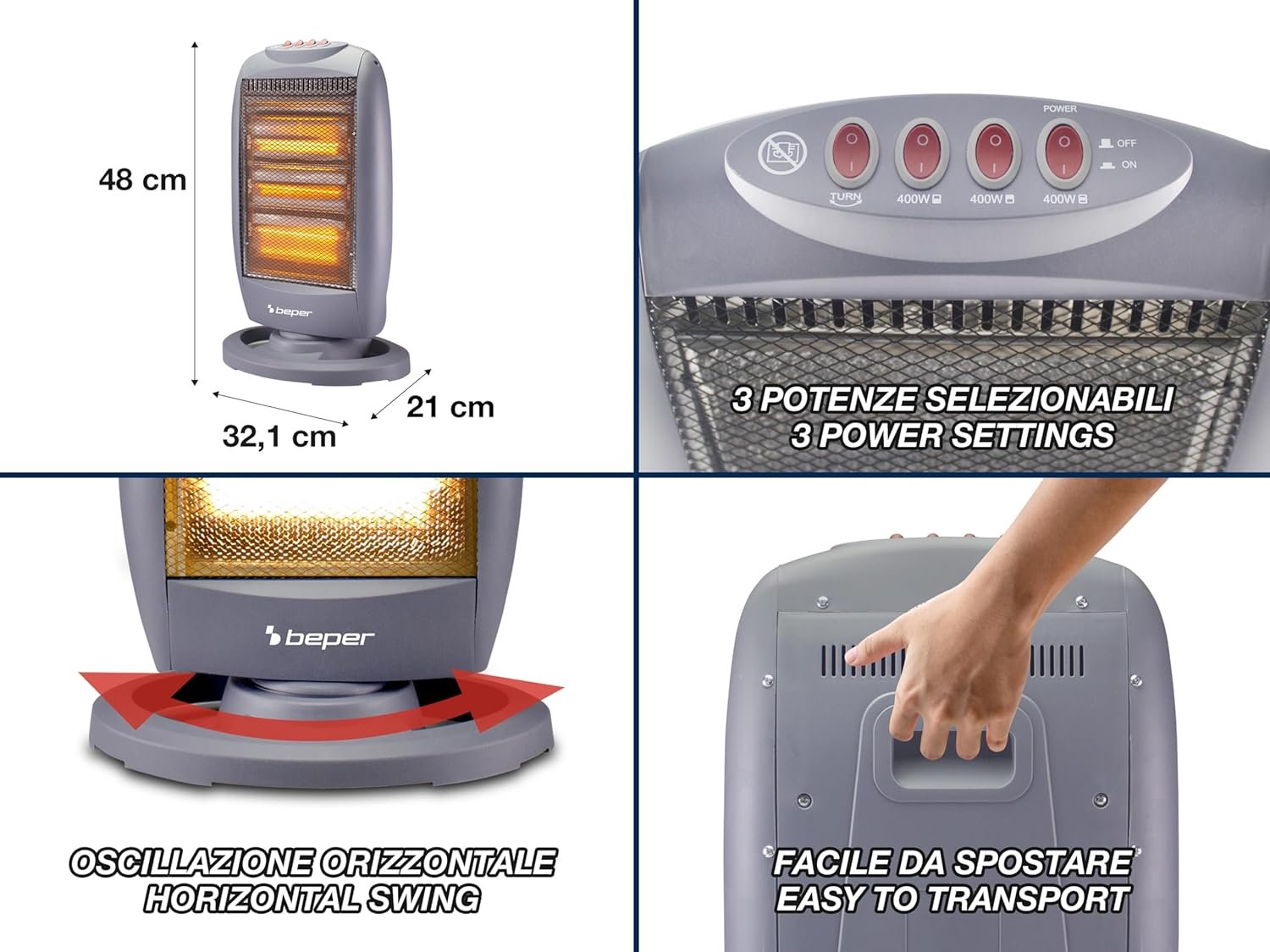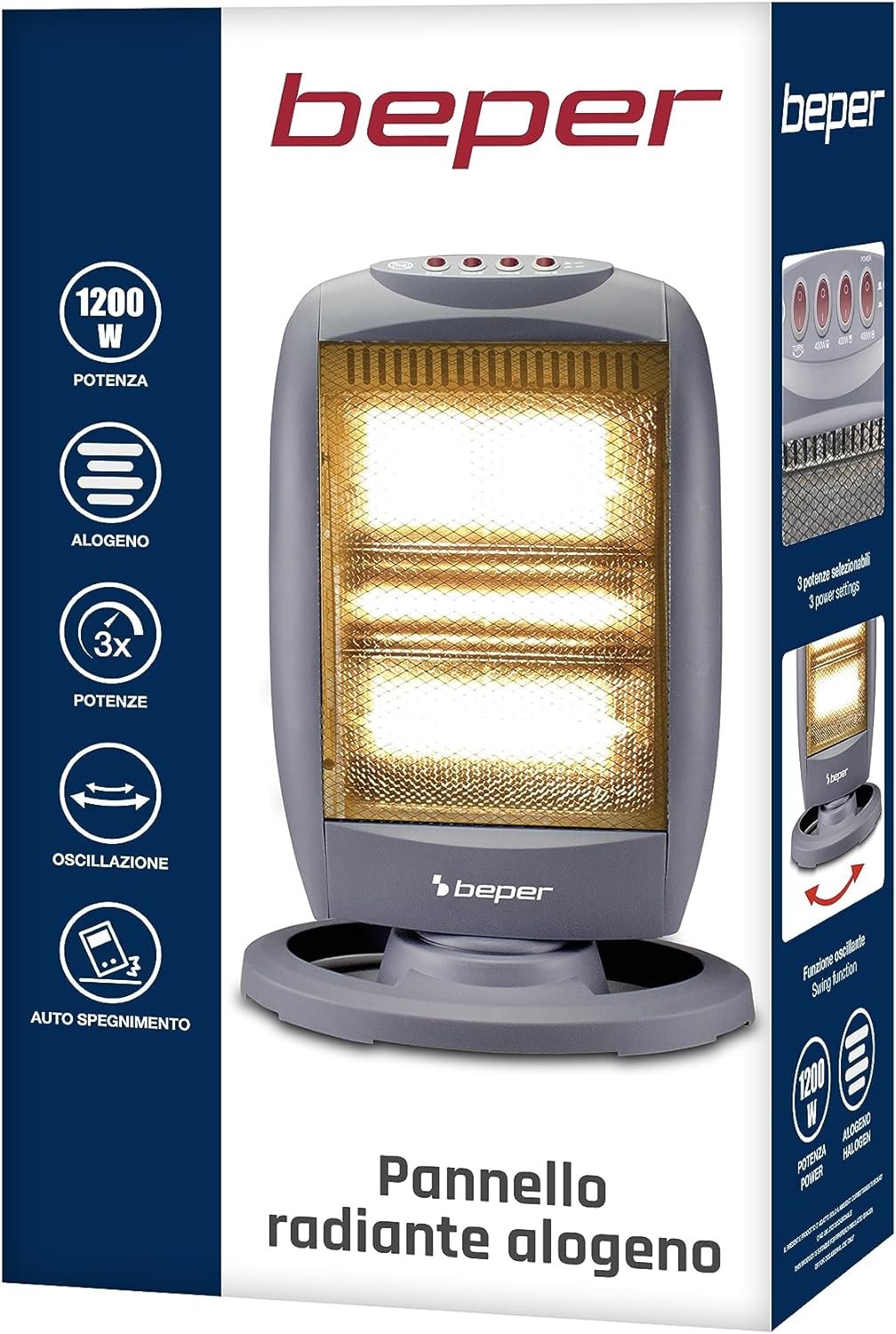 BEPER P203PAN010 Radiateur Halogène Oscillant, 1200W, Basse Consommation, Silencieux, Panneau de Commande et Poignée de Transport, Gris
