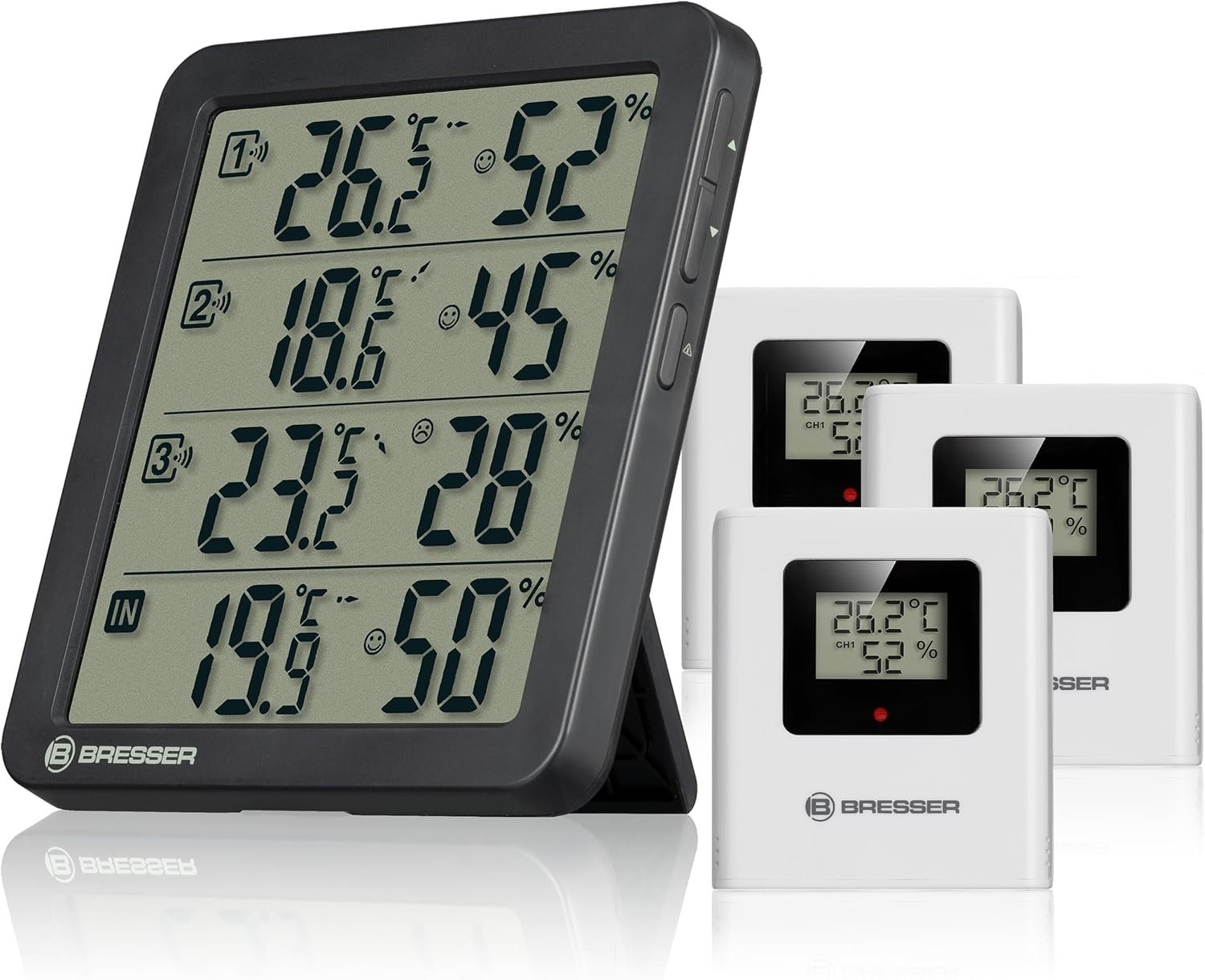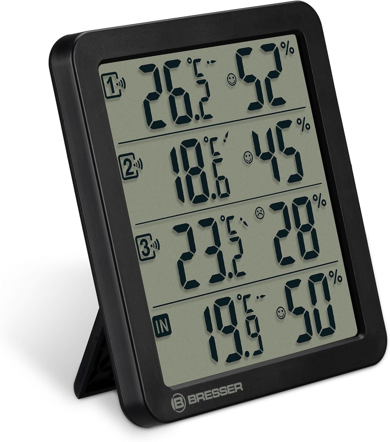 Bresser Thermo-hygromètre Quadro NV avec 4 points de mesure, capteur intégré et 3 capteurs sans fil, indicateur de confort Smiley, mémoire Min/Max, IP44, noir