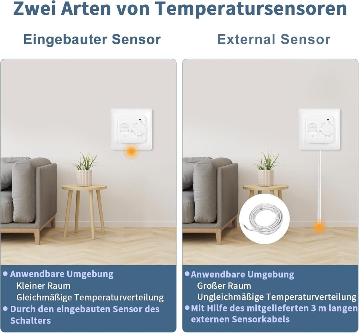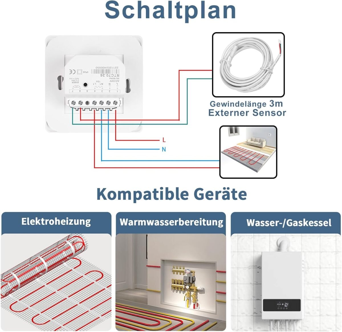 CNBINGO Thermostat d’ambiance numérique encastré avec sonde, pour tous les types de chauffage, y compris les chauffages au sol et chaudières, blanc