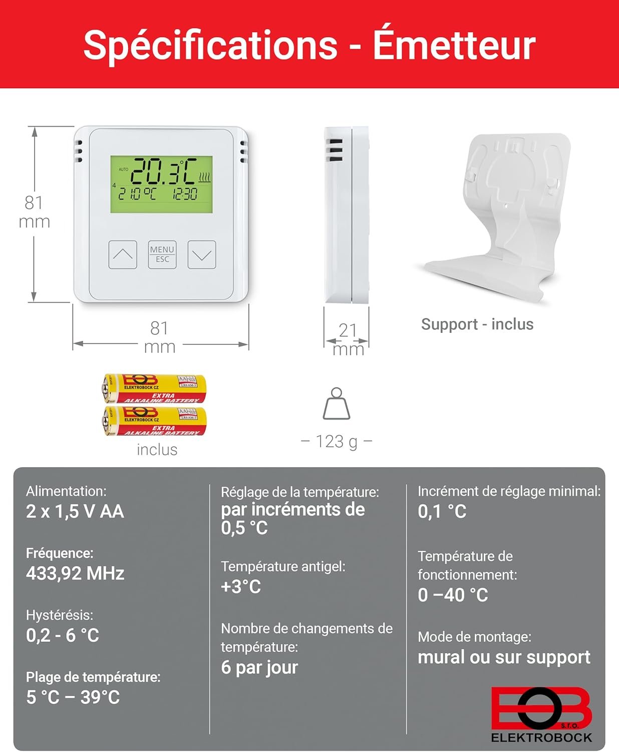 ELEKTROBOCK BT731 Thermostat d’ambiance sans Fil avec récepteur – Support – Portée jusqu’à 35 m – pour Chauffage électrique et Infrarouge – Programmes hebdomadaires et Protection antigel, Blanc