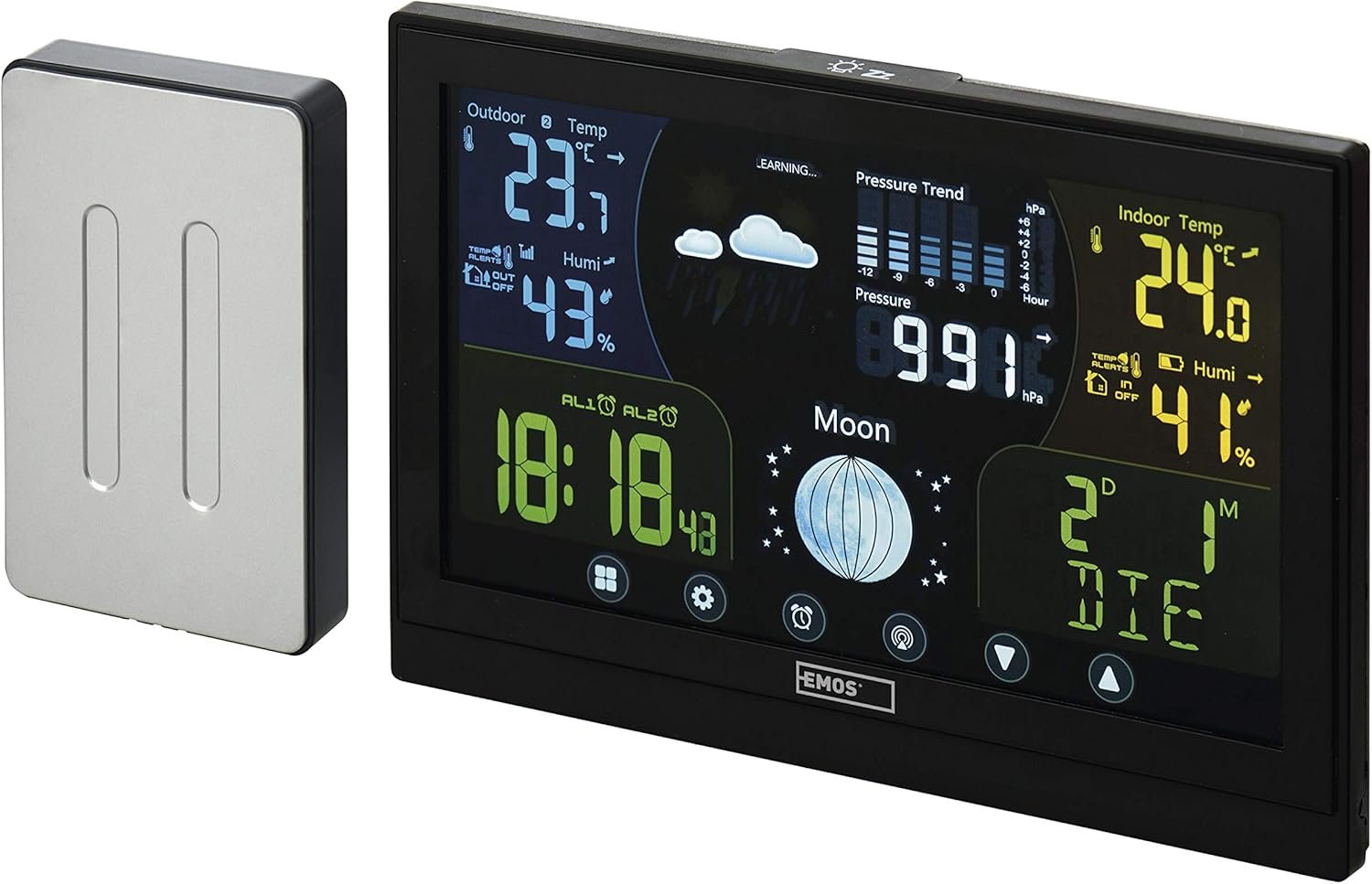 EMOS E6018 Station météo Radio avec capteur extérieur et écran Tactile Couleur + Bloc d’alimentation 13 Fonctions : thermomètre, hygromètre, baromètre, prévisions météo, Horloge Radio