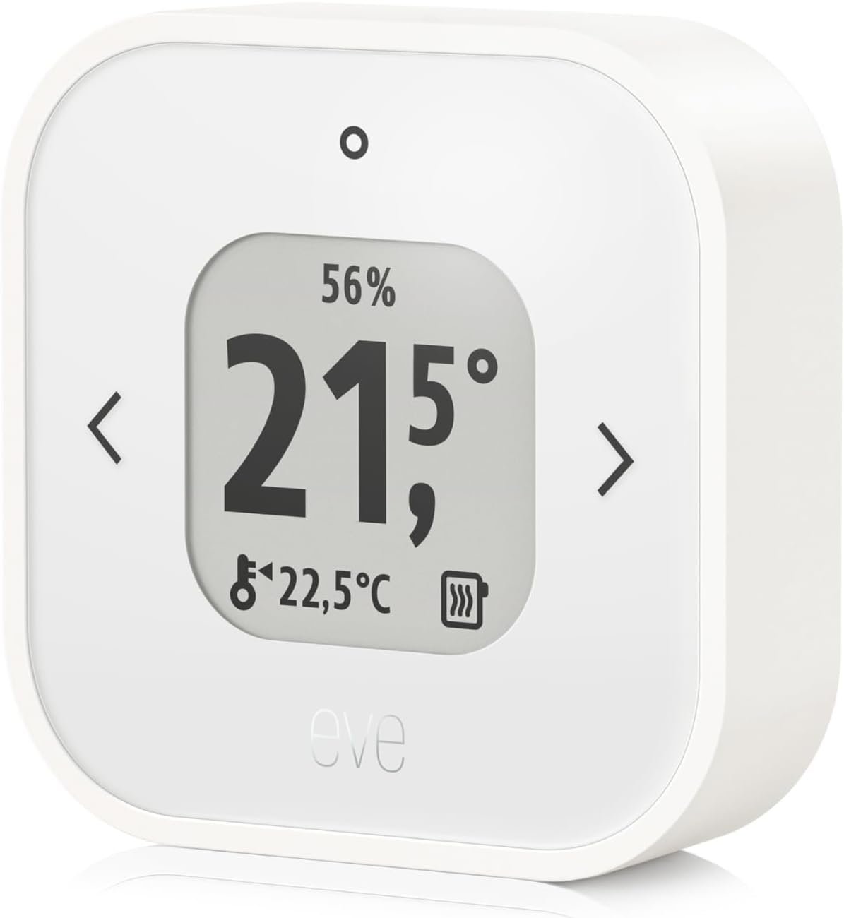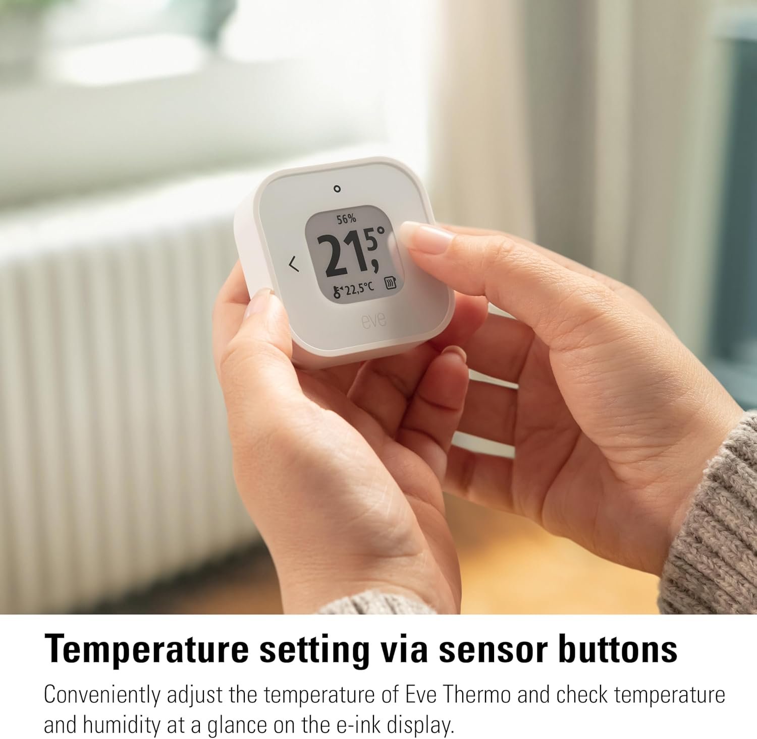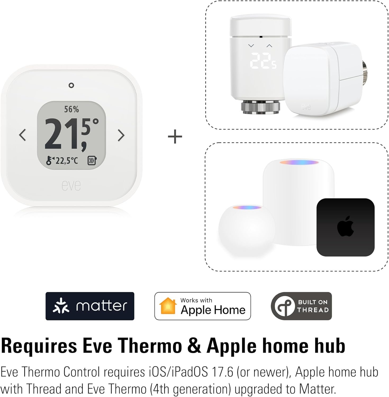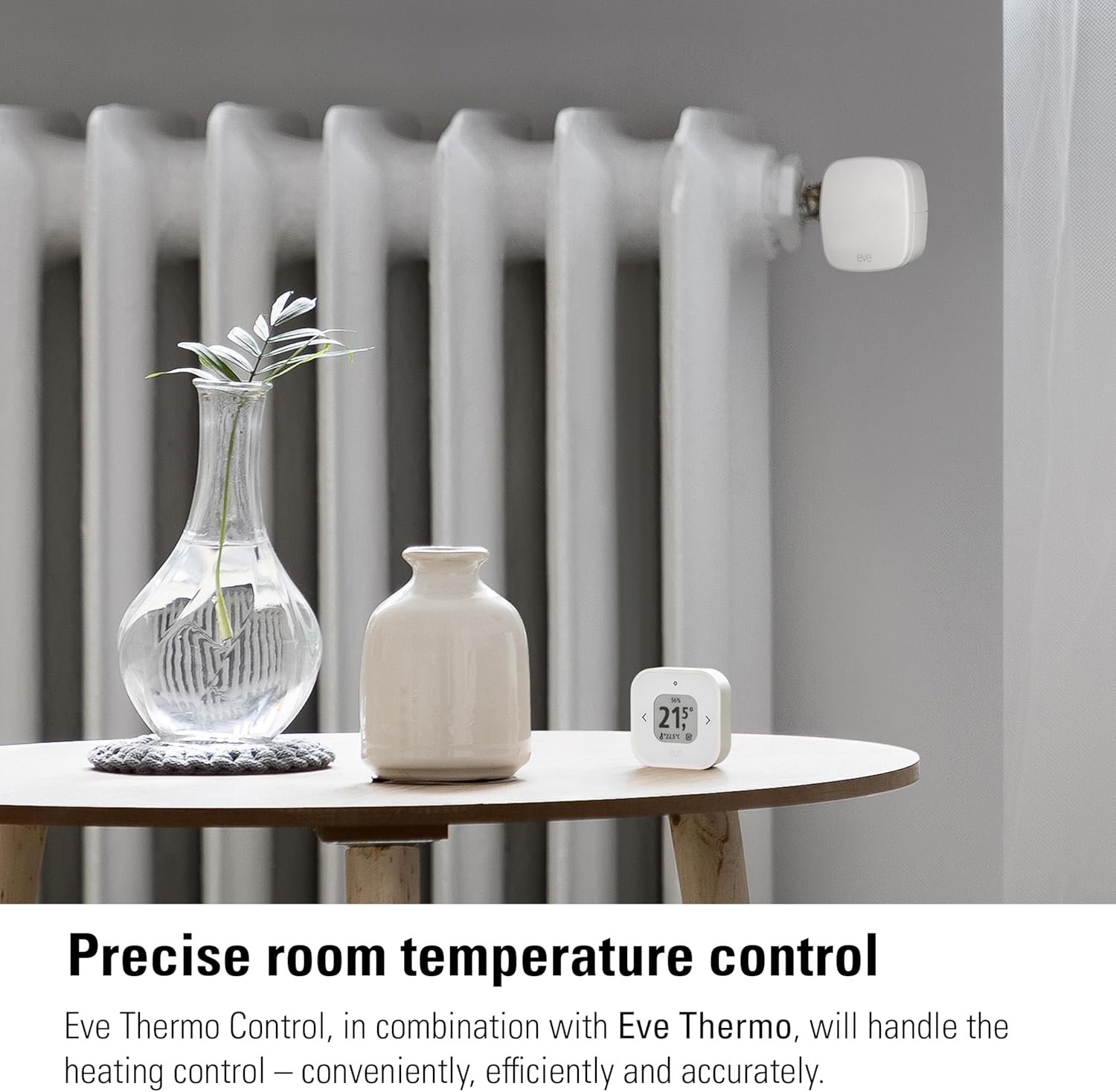 Eve Thermo Control (Matter) – Capteur & régulateur de température Thermo (Matter), Compatible avec Apple Maison, nécessite Apple TV 4K (2e gén/3e gén 128 Go), HomePod (2e gén) ou HomePod Mini