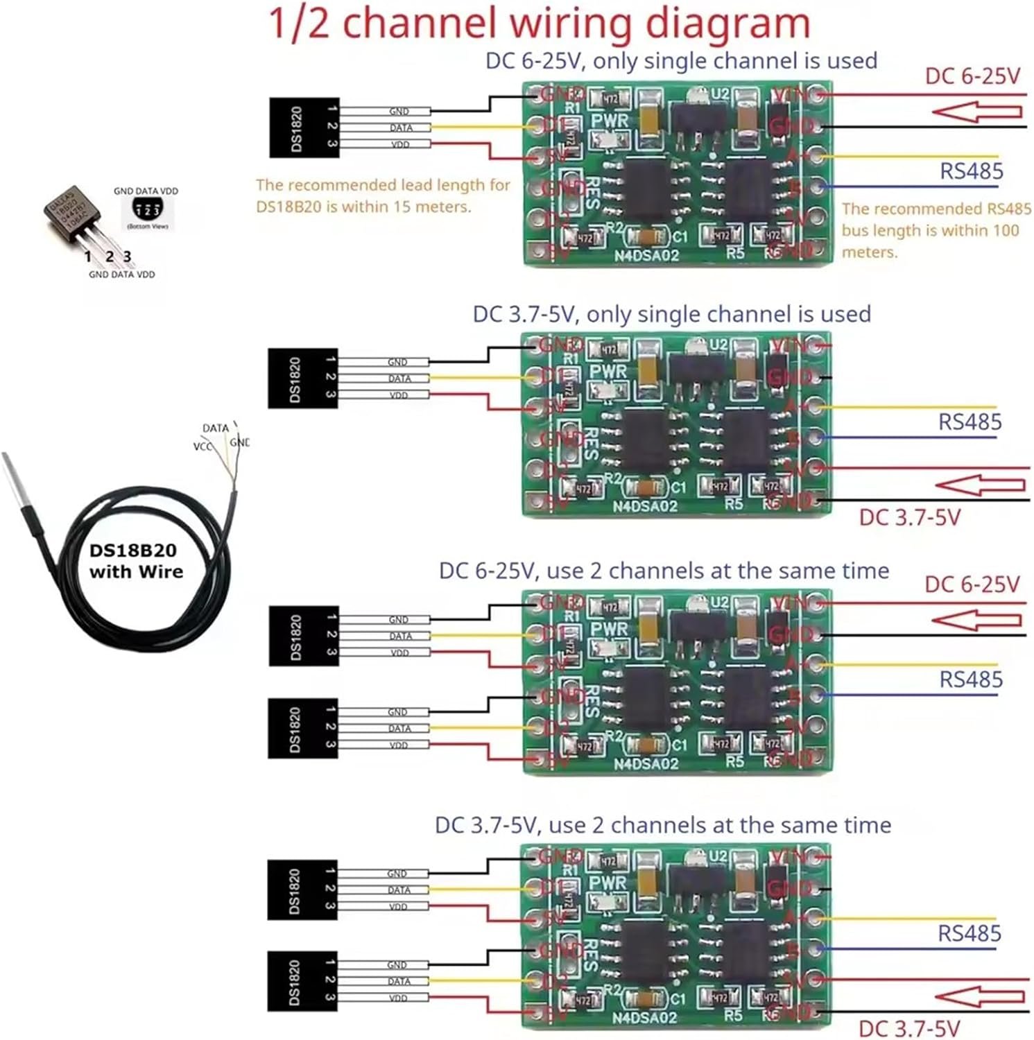 FackLOxc 2CH RS485 Collecteur de température numérique N4DSA02 Capteurs 5 V 12 V 24 V Entrée pour thermostat maison R46CA02