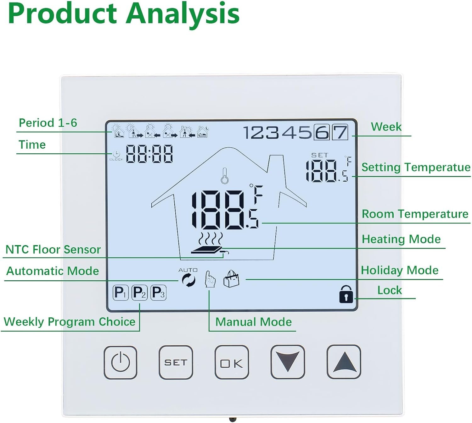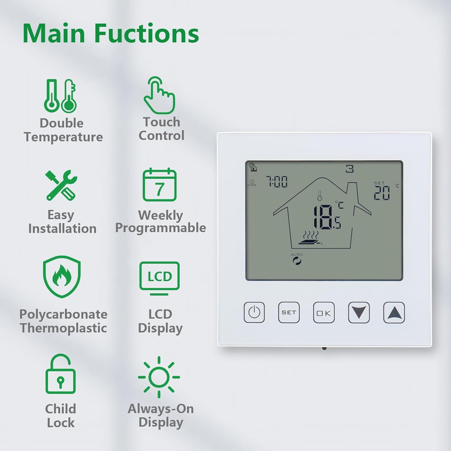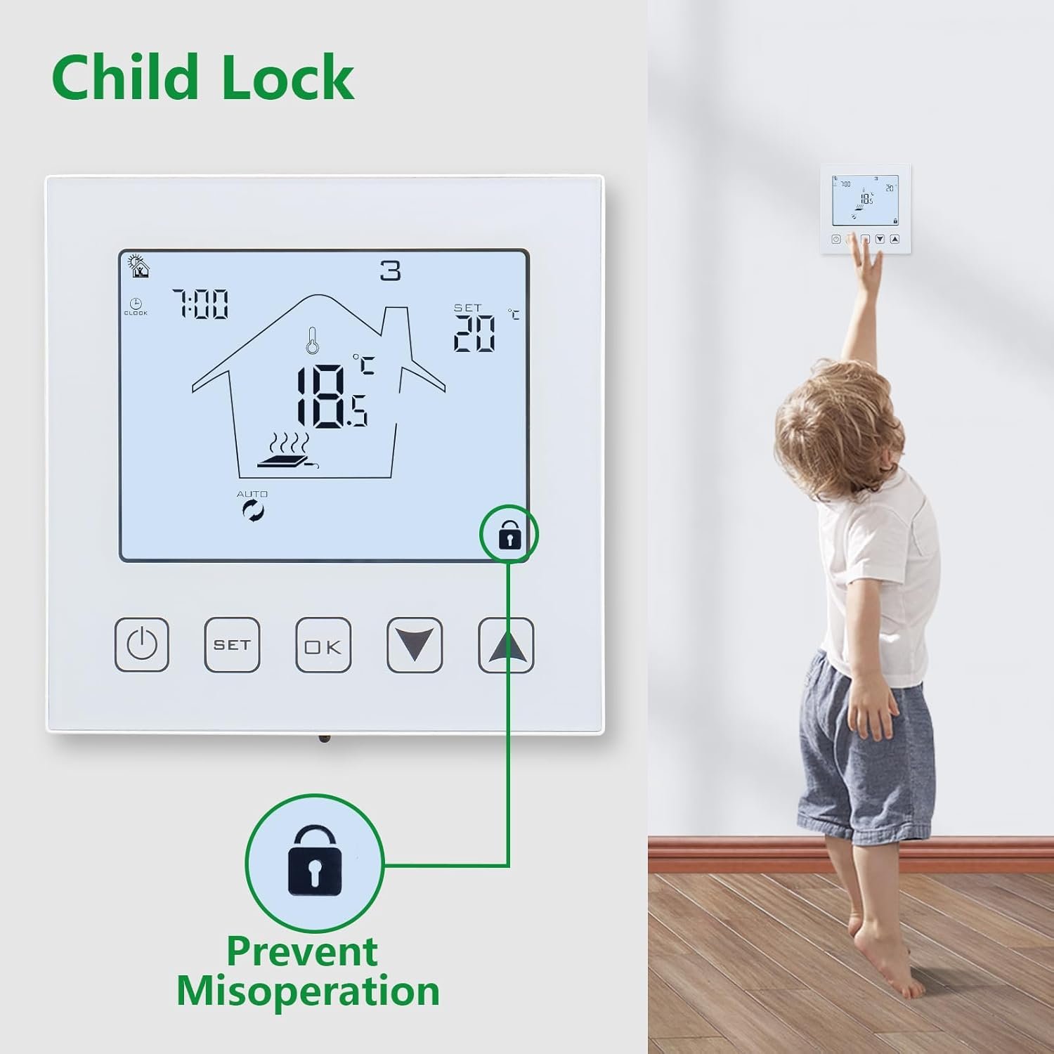 Home Thermostat Programmable WG603, AC230V max3A Écran Tactile LCD Affichage Travail pour Radiant Plancher Chauffant Blanc