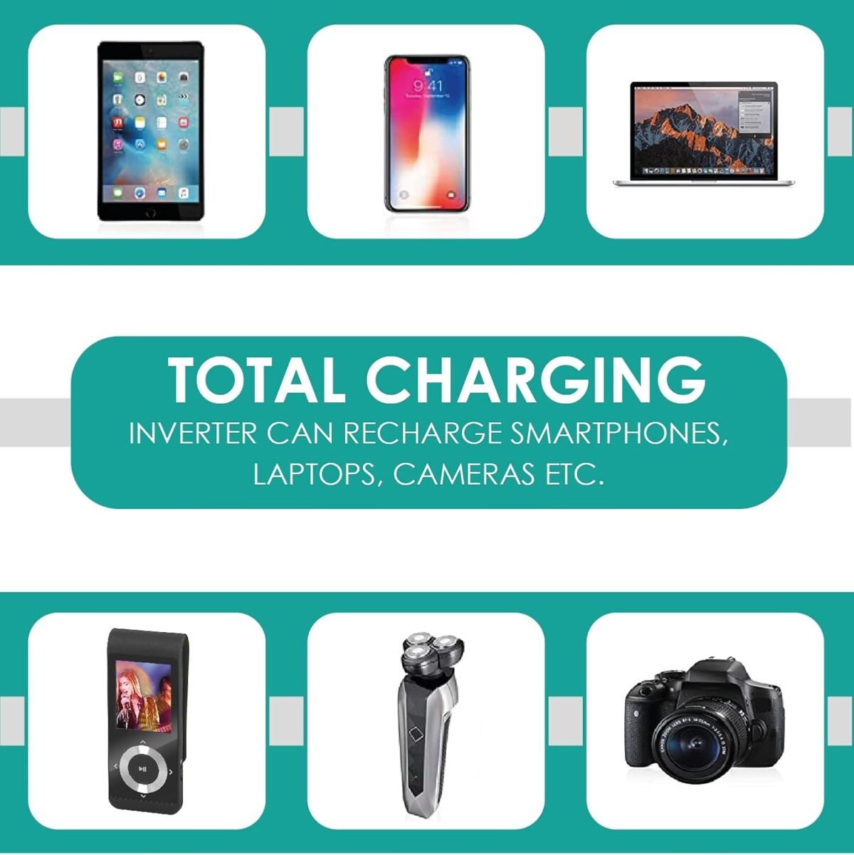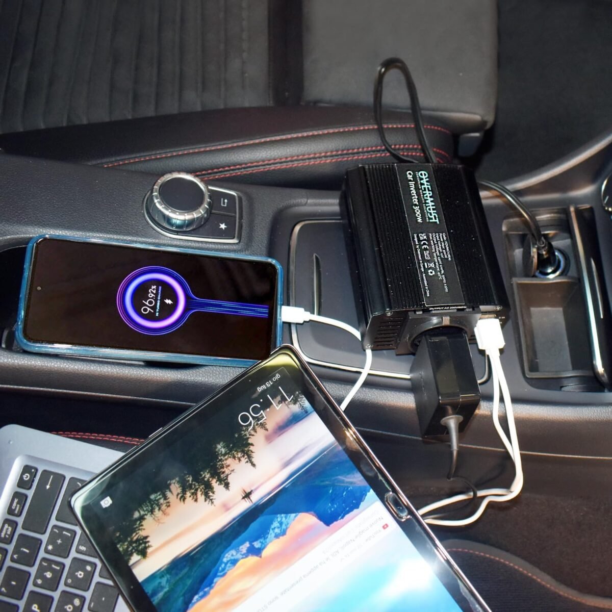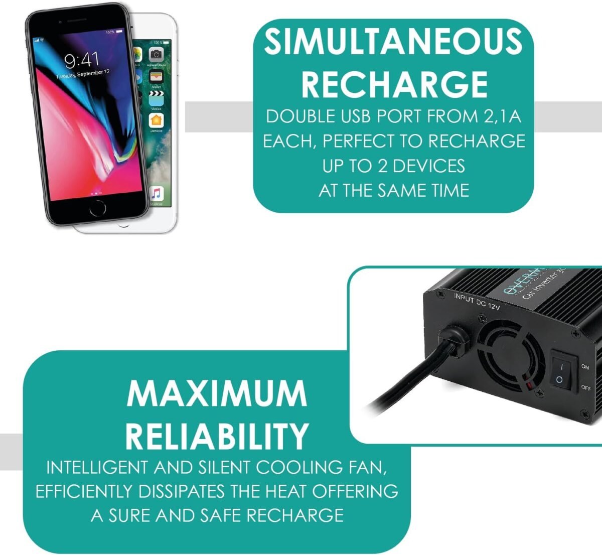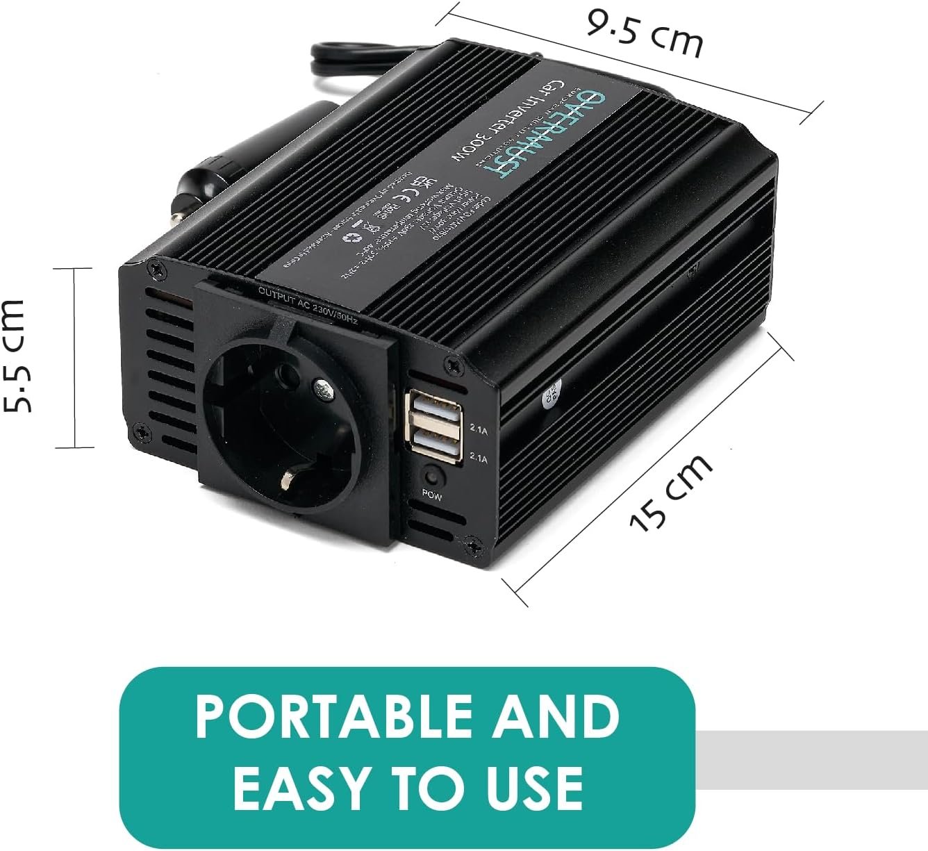 Inverter Voiture 12V 220V 300W | Adaptateur Prise Auto/Électrique | Transformateur Double Port USB | Protection Surchauffe | Prise Schuko 220V | Prise Allume Cigare