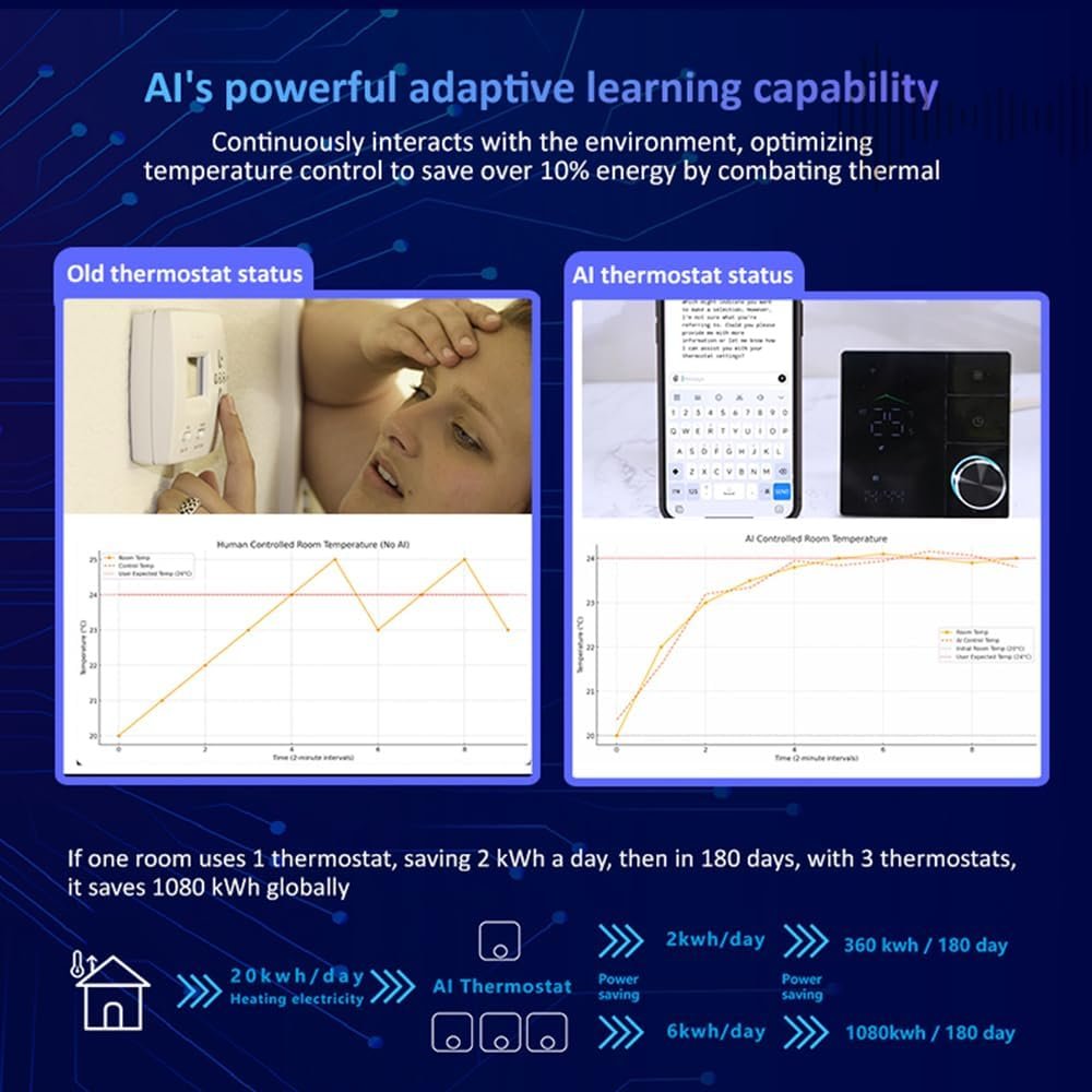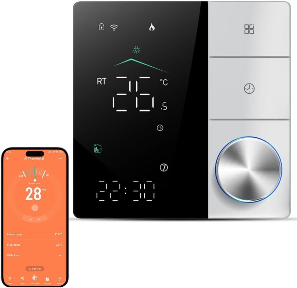 Irishom 2024 Thermostat Wi-Fi électrique amélioré avec apprentissage intelligent AI/contrôle des applications/écran tactile numérique LED-noir et blanc