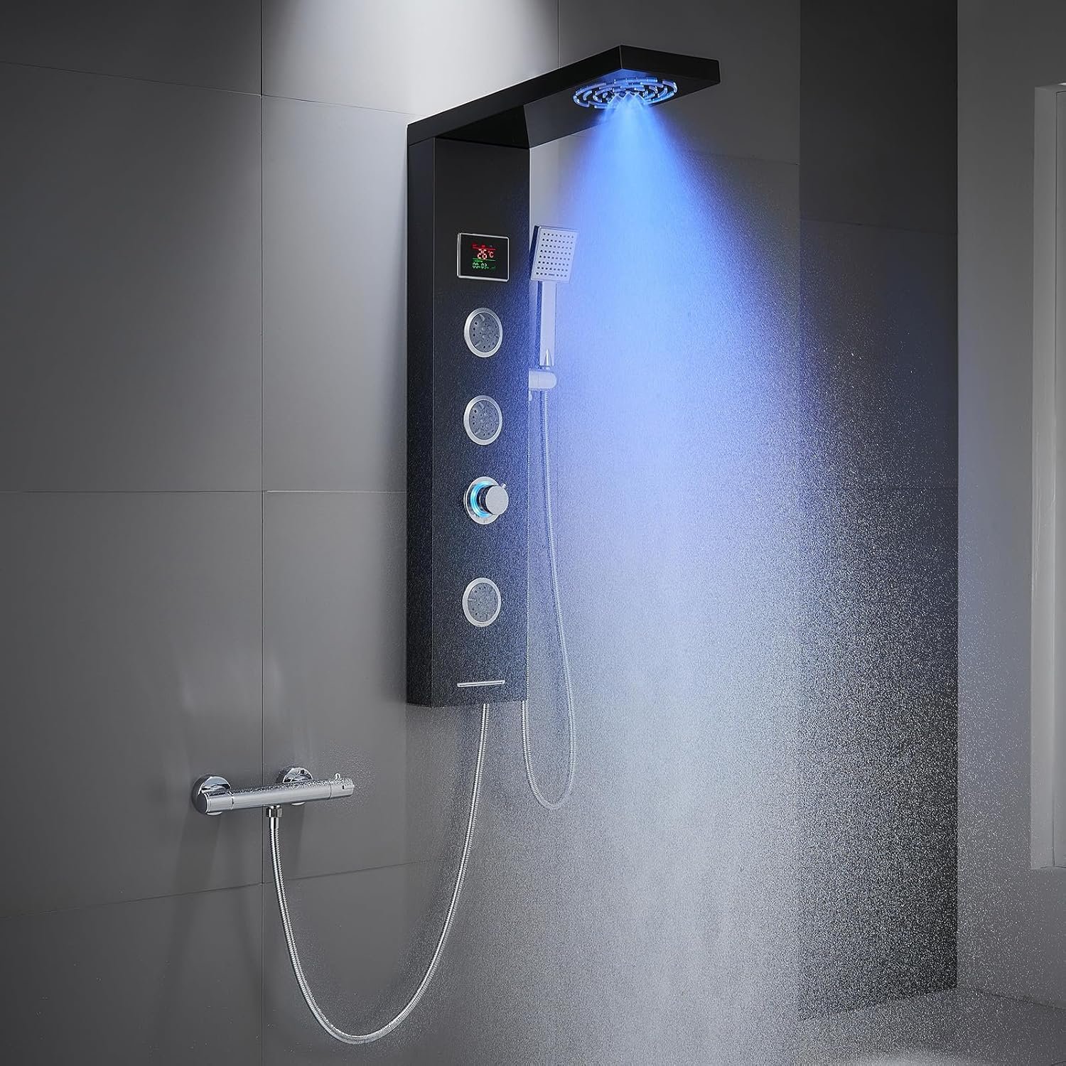 KINKIBOS Colonne de douche sans robinet, panneau de douche 6 fonctions avec affichage LED de la température, douche à effet pluie, douche à brouillard, 2 modes de jets de massage, douchette à main et