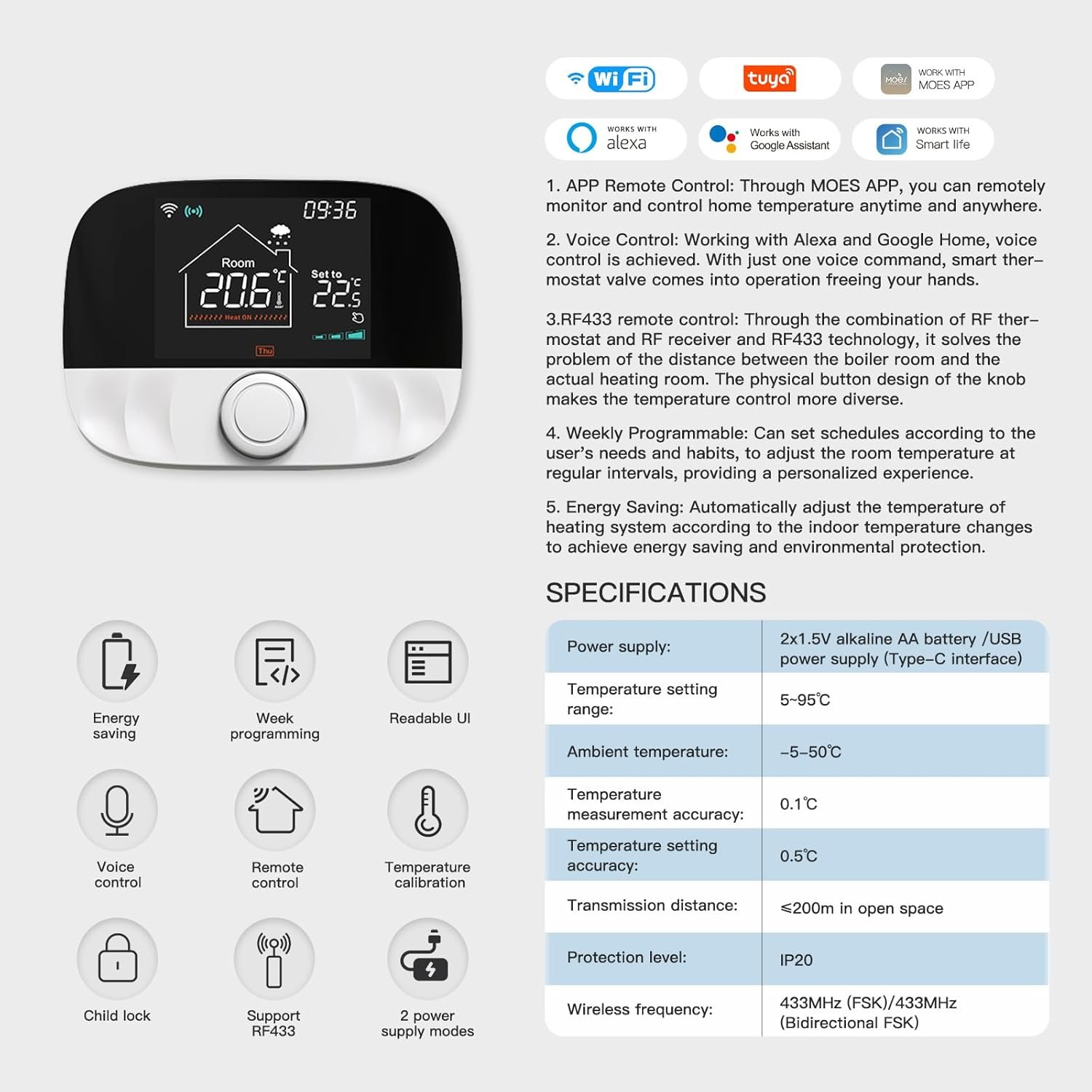 LEDLUX LL0255 Thermostat sans fil RF Chronothermostat numérique hebdomadaire tactile pour chaudière à gaz et chauffage radiateur à eau 3 A 220 V