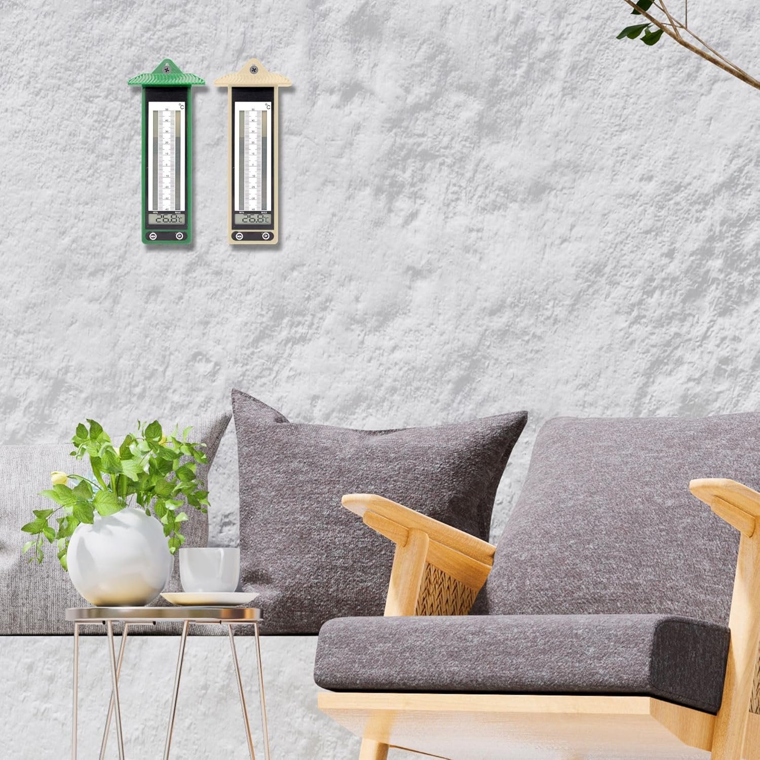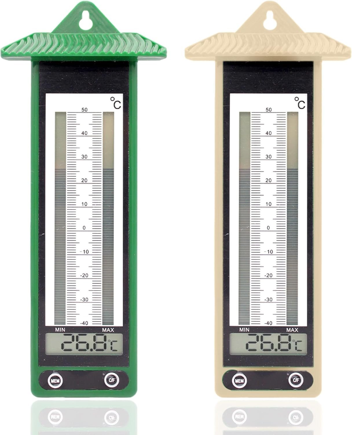 Lot de 2 Thermomètre FISHTEC Extérieur pour Jardin – Affichage Digital – Températures extrêmes (-40 °C / +50°C) – 22 cm x 9 cm – Beige & Vert
