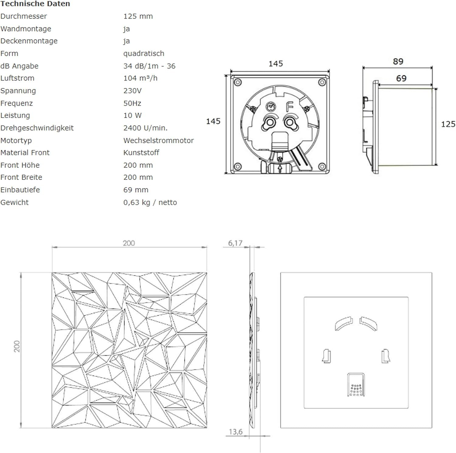 MKK Ventilateur de salle de bain avec panneau diamant – Blanc – Diamètre : 125 mm – Capteur d’humidité/hygrostat
