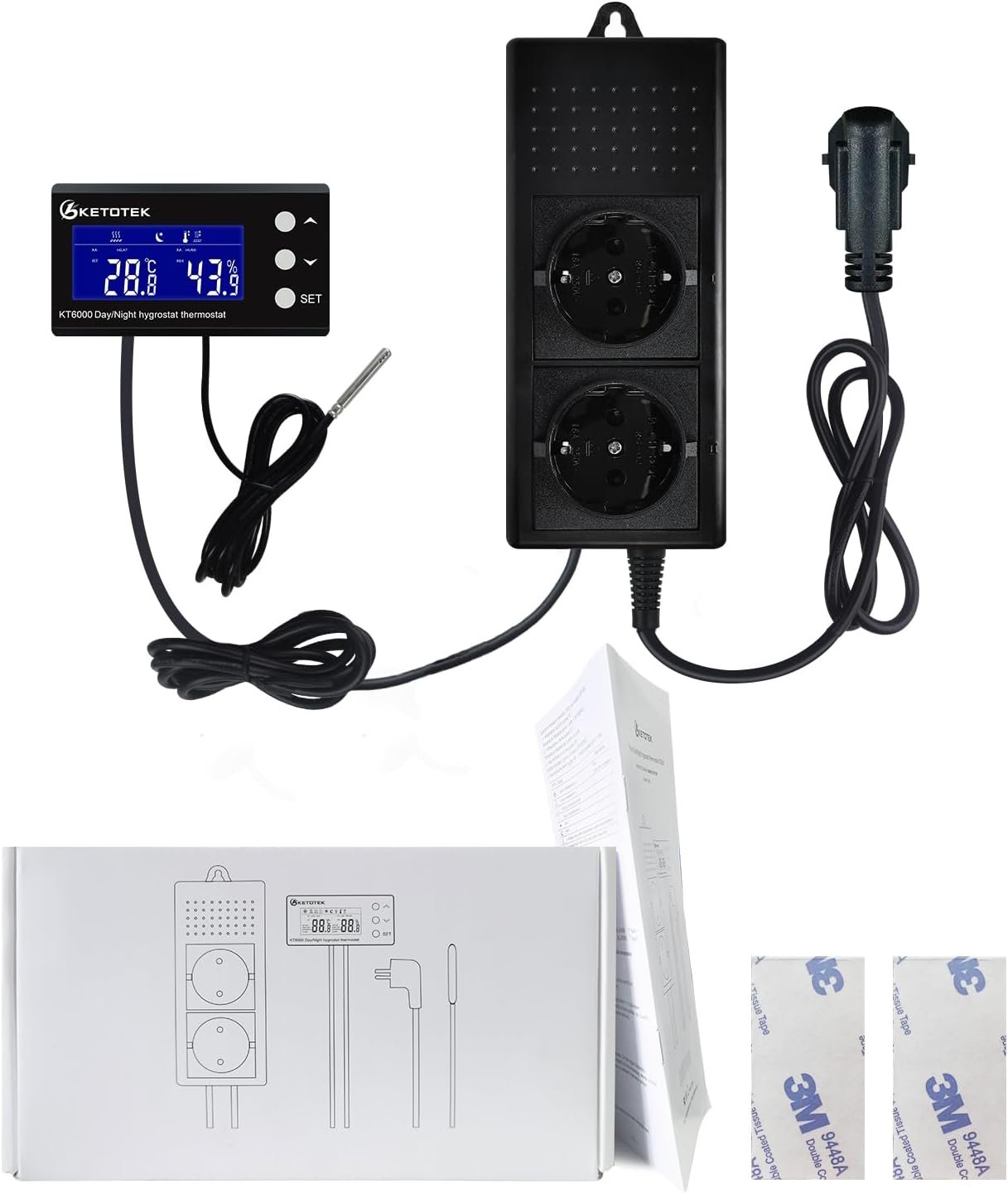 Prise Thermostat Hygrostat Jour/Nuit avec Sonde, Régulateur de Température et d’humidité Numérique avec Minuterie 220V pour Terrarium Reptile Couveuse Incubateur Serre