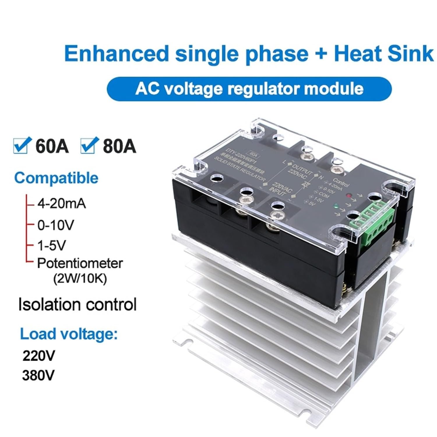 Relais régulateur de tension 220 V 380 V 60 A 80 A avec dissipateur thermique, contrôle monophasé, isolation améliorée, régulateur de puissance, 1 pièce(60A,220v)