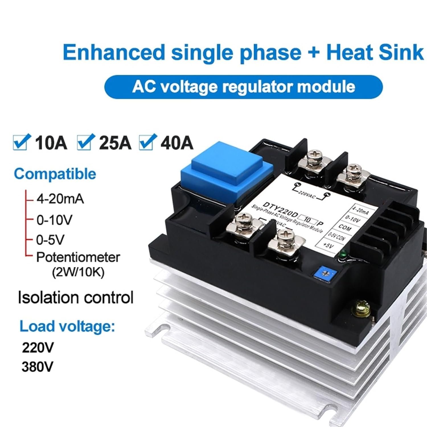 Relais régulateur de tension CA monophasé avec dissipateur thermique, contrôle par potentiomètre, DTY 220 V 380 V, 1 pièce(25A,380V)
