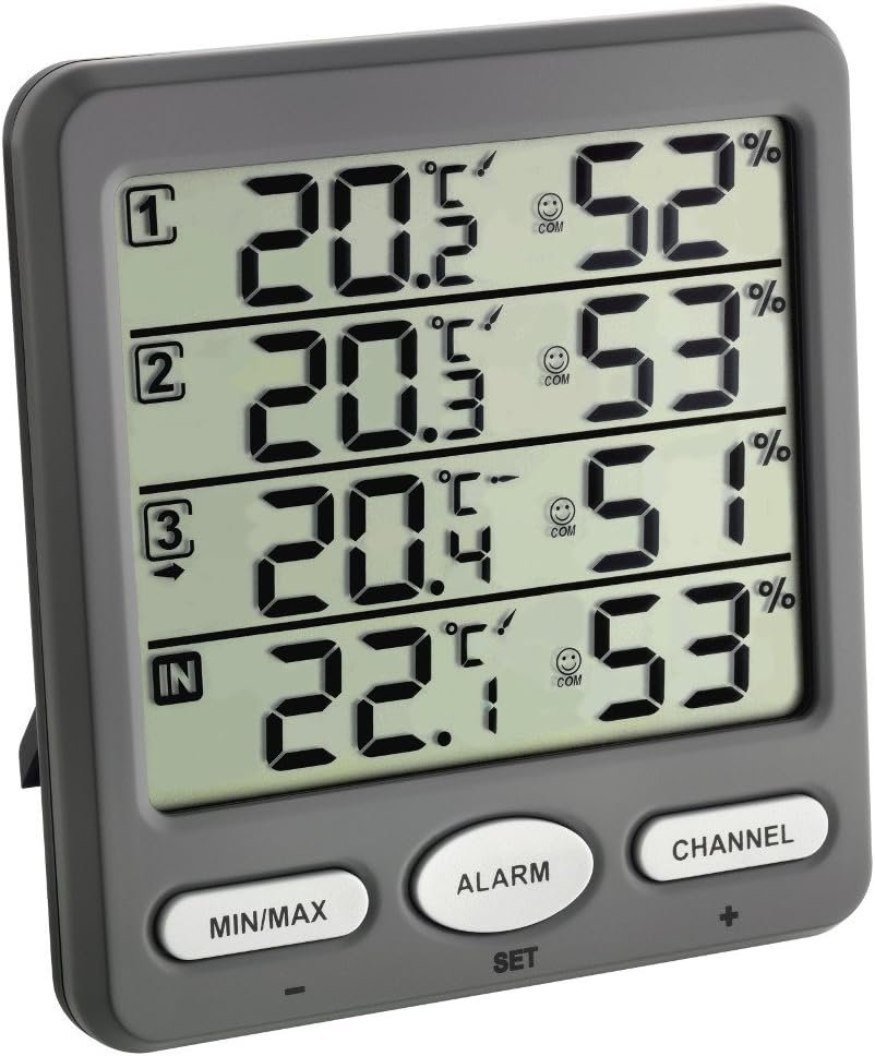 Be the first to review “TFA Dostmann Thermomètre-hygromètre sans fil Klima-Monitor avec 3 capteurs, 30.3054.10, pour mesurer température ambiante et humidité, réglage de l’alarme, fonction max/min, gris” Cancel reply
