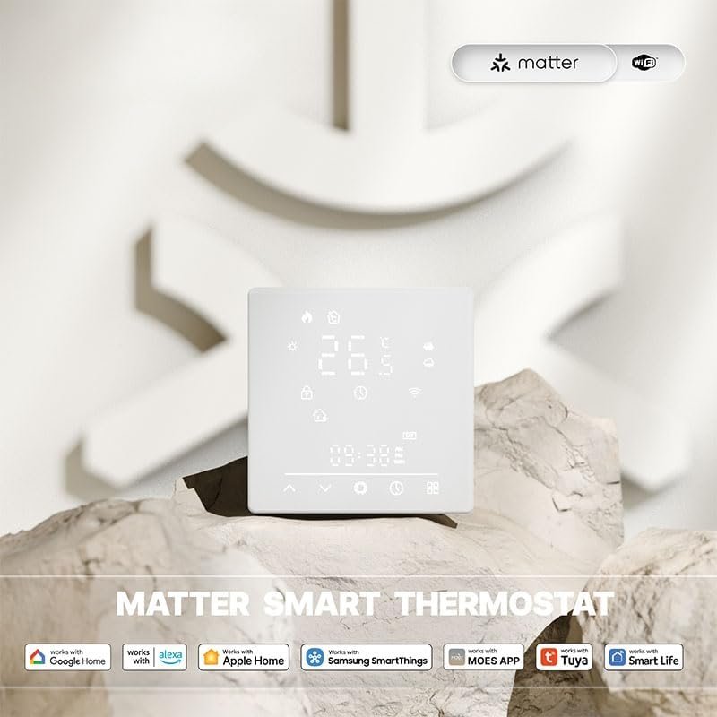 Thermostat Intelligent Matter WiFi, 230V 16A, Compatible avec Apple Home, Google Assistant, Alexa, Samsung SmartThings, Tuya, Smart Life, Blanc. (pour chaudière à gaz)