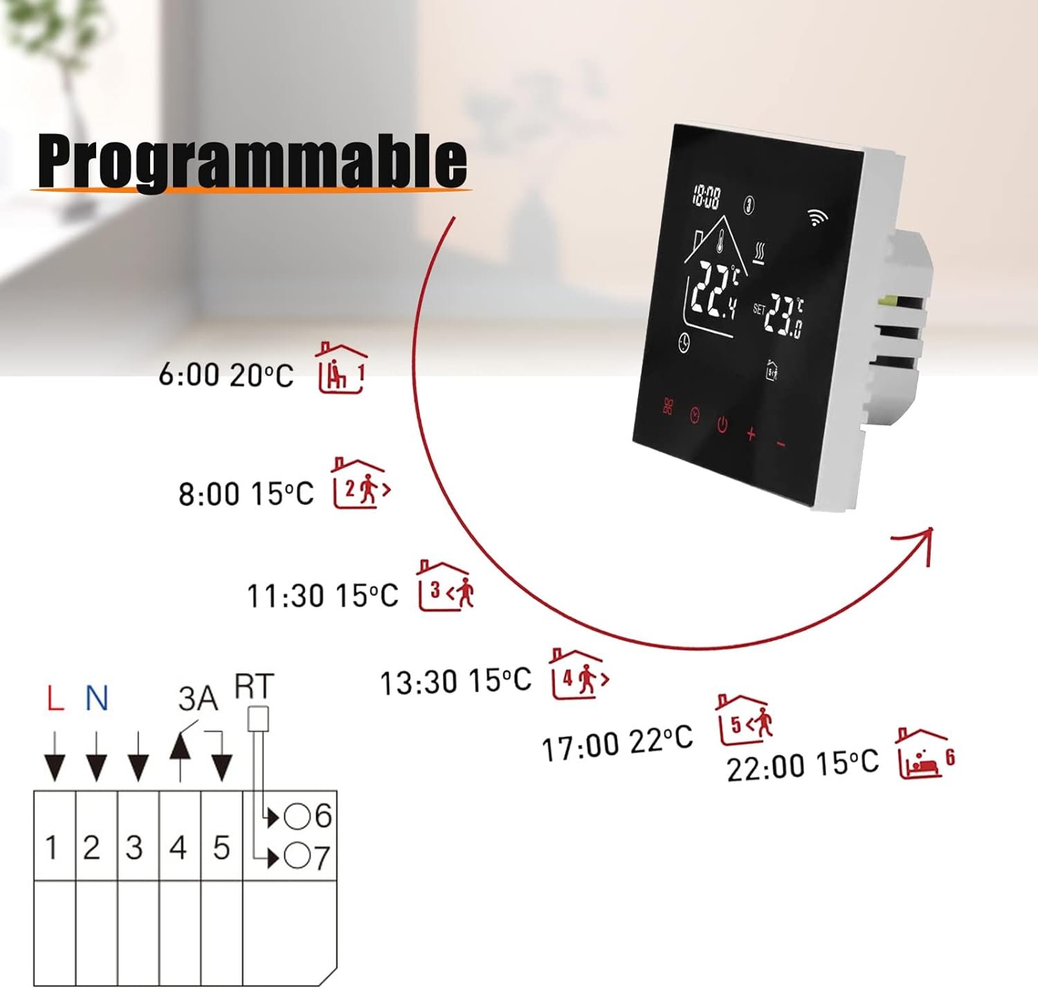 Thermostat WiFi intelligent – Chauffage par pieds – Écran LED – Écran tactile – Thermostat d’ambiance numérique – Compatible avec Alexa, Google Home (noir – Chauffage de chaudière 3 A)