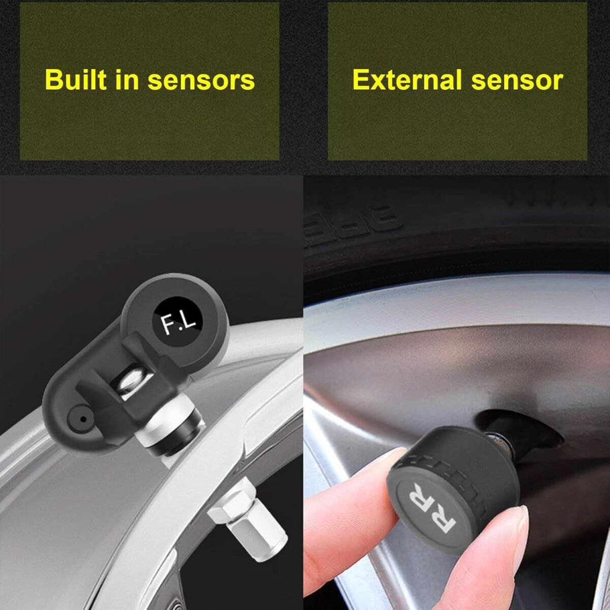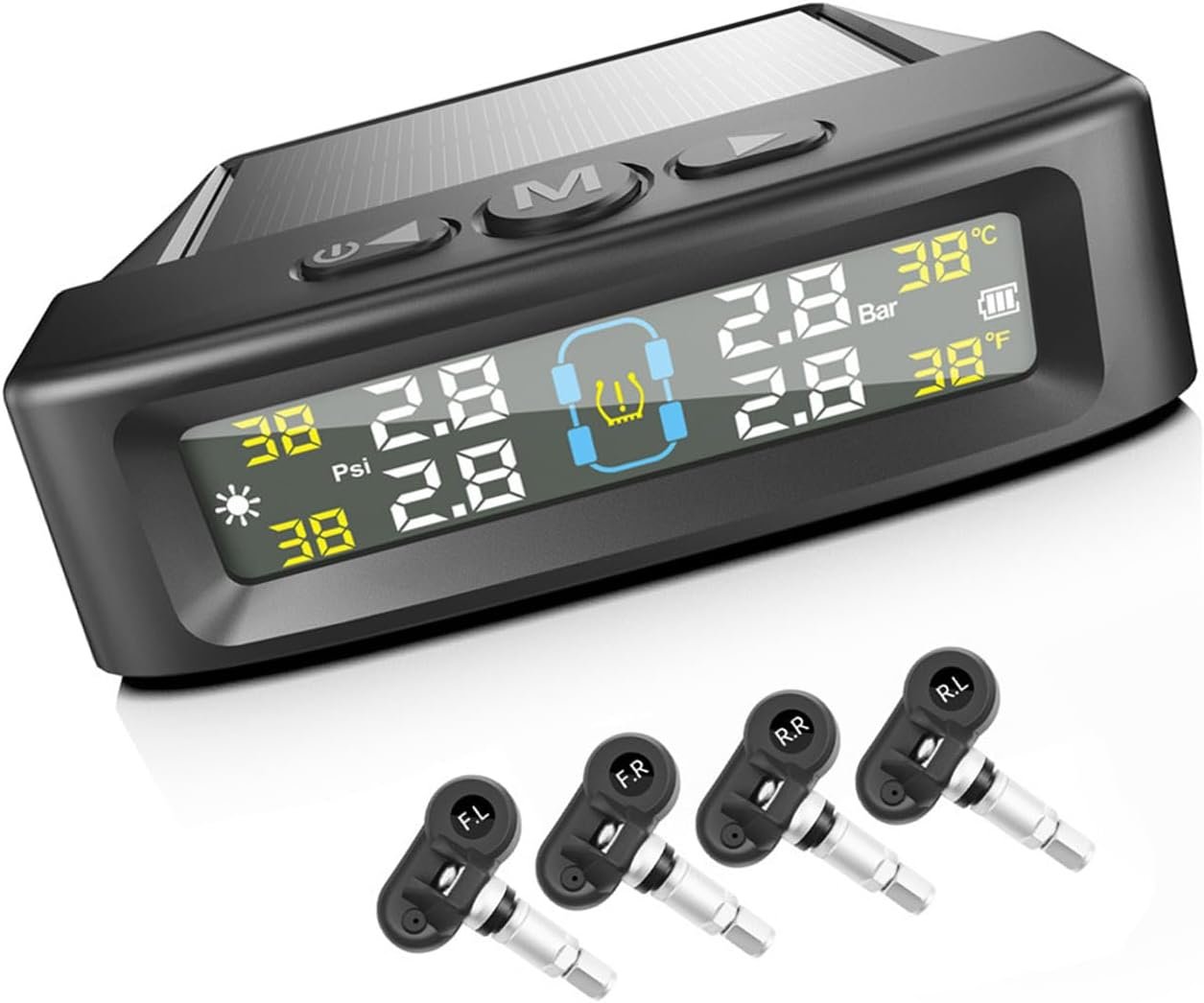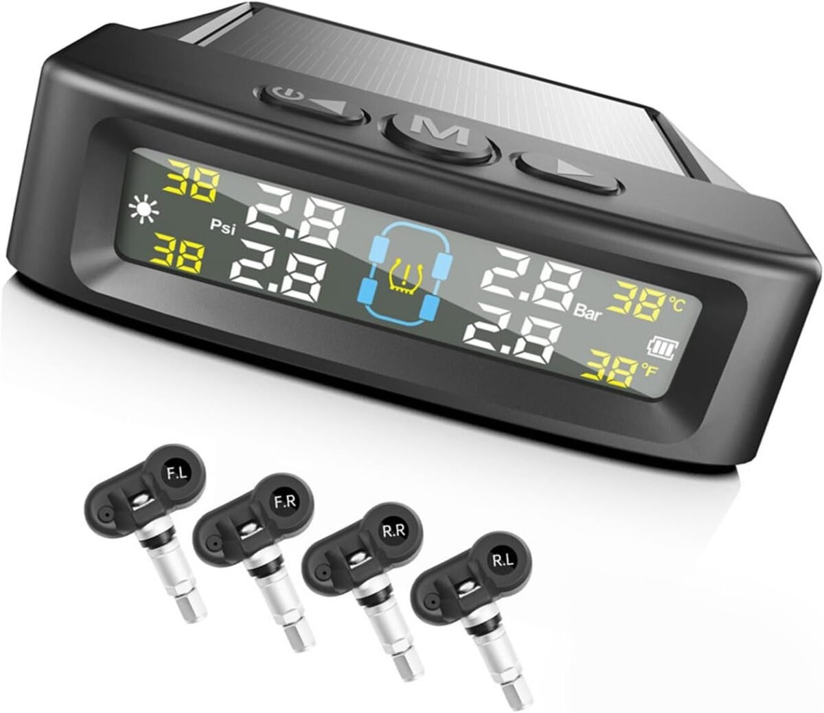 WATERBELINE TPMS Système d’alarme de pression des pneus de voiture 4 capteurs Affichage solaire Avertissement de pression des pneus de température